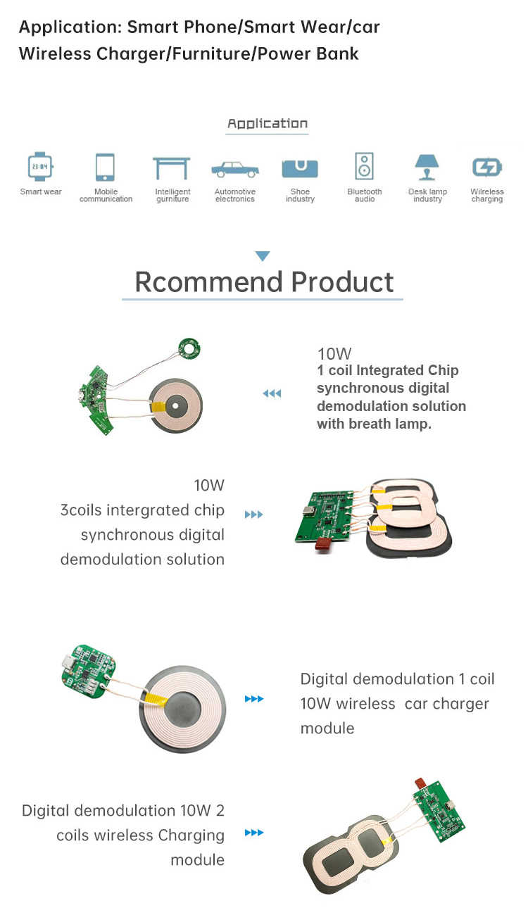 15W Qi Wireless Charging Receiver Module Fast Wireless Charging Qi Wireless Charger Receivervehicle wireless charger solution PCBA Size can be customized Coil Size:50*50mm can be customized Input Power5V-2A; 9V-1.67A;12V-1.5A Output 5W / 7.5W / 10W/15W Conversion Efficiency 85% Max Transmitting D......